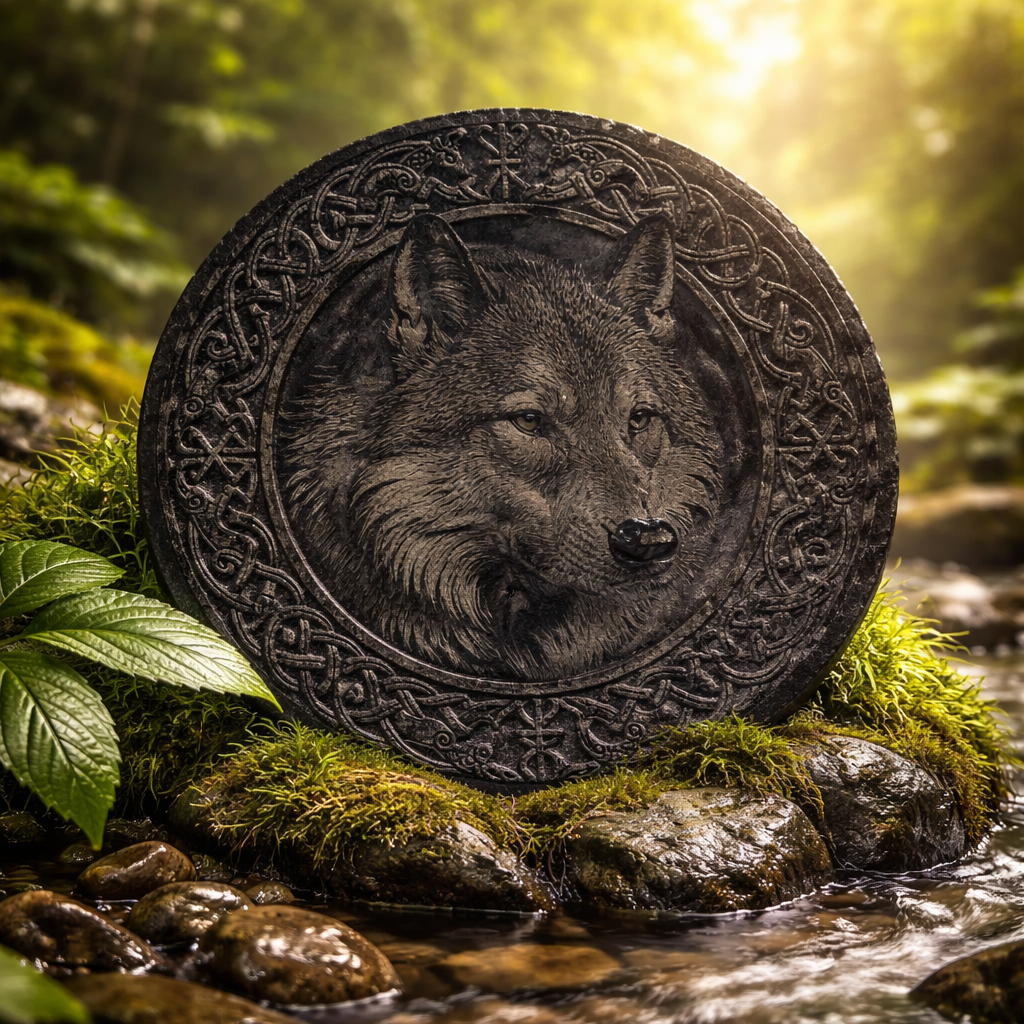 Wolf mit Celticrahmen,auf Schieferplatte graviert. Ca. 30 cm Durchmesser